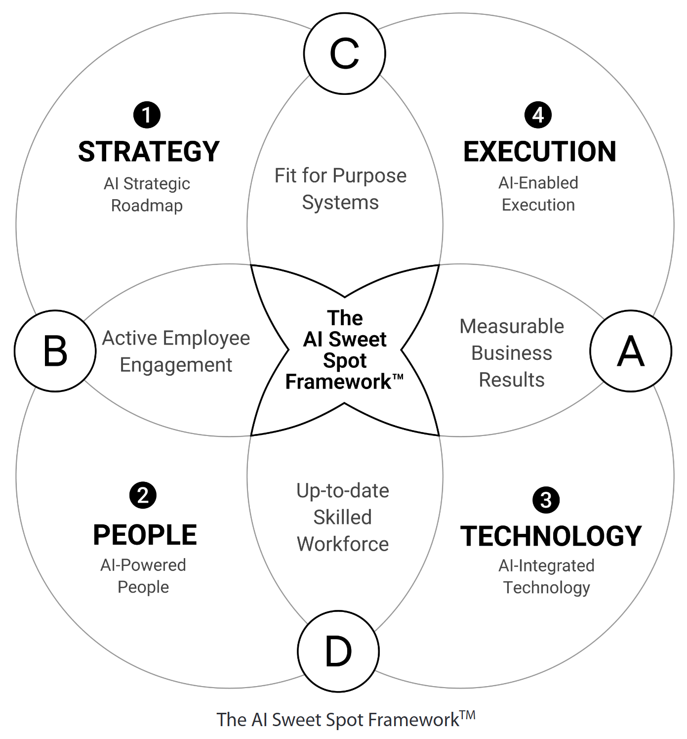 The AI Sweet Spot Framework™ systematizes this approach. It aligns strategy, people, technology, and execution so each builds on the last, ensuring outcomes are defined before tools are selected, teams are prepared before deployment happens, and value is measured at every stage.